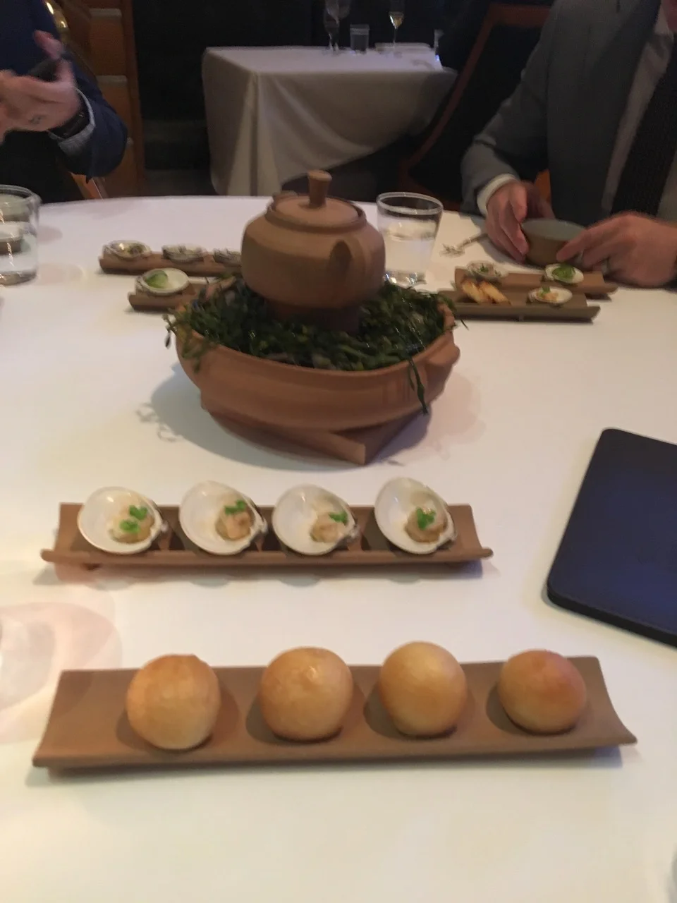 Ok but what does that name/description mean? Well, they brought us out little planks of soft little warm parker house rolls (foreground), then planks of itty bitty clams with accoutrements in shells (rear plank and planks in the back...there were a few different clams to try) and then in that teapot, sitting on hot rocks and seaweed, was the veloute, which the internet tells me means a light sauce thickened with a blond roux. But it was like a sipping chowder. Everything, very delicious.